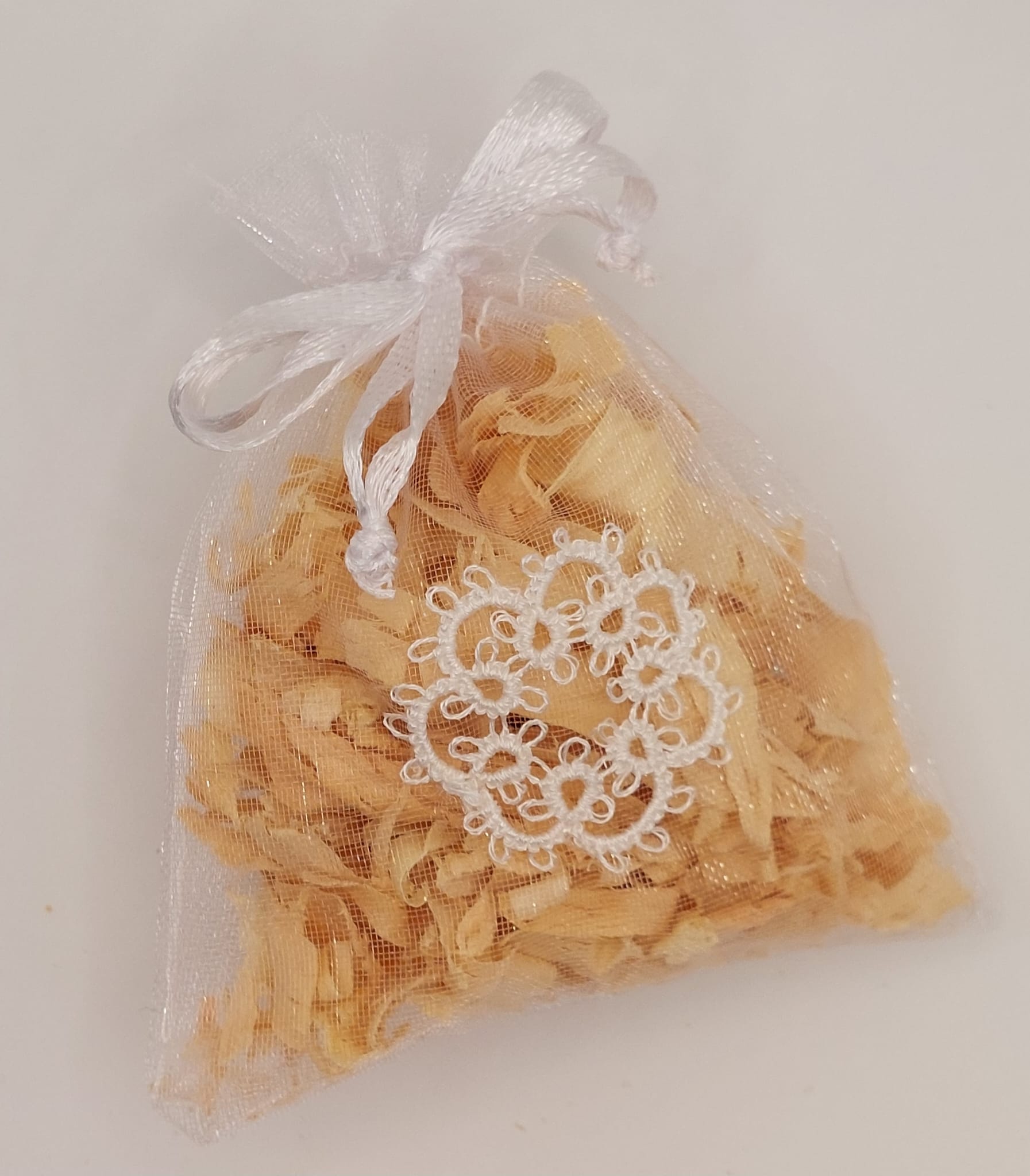 Kleines Duftsäckchen aus Organza, verziert mit Frivolité Deckchen, gefüllt mit Zirbenholzspänen.