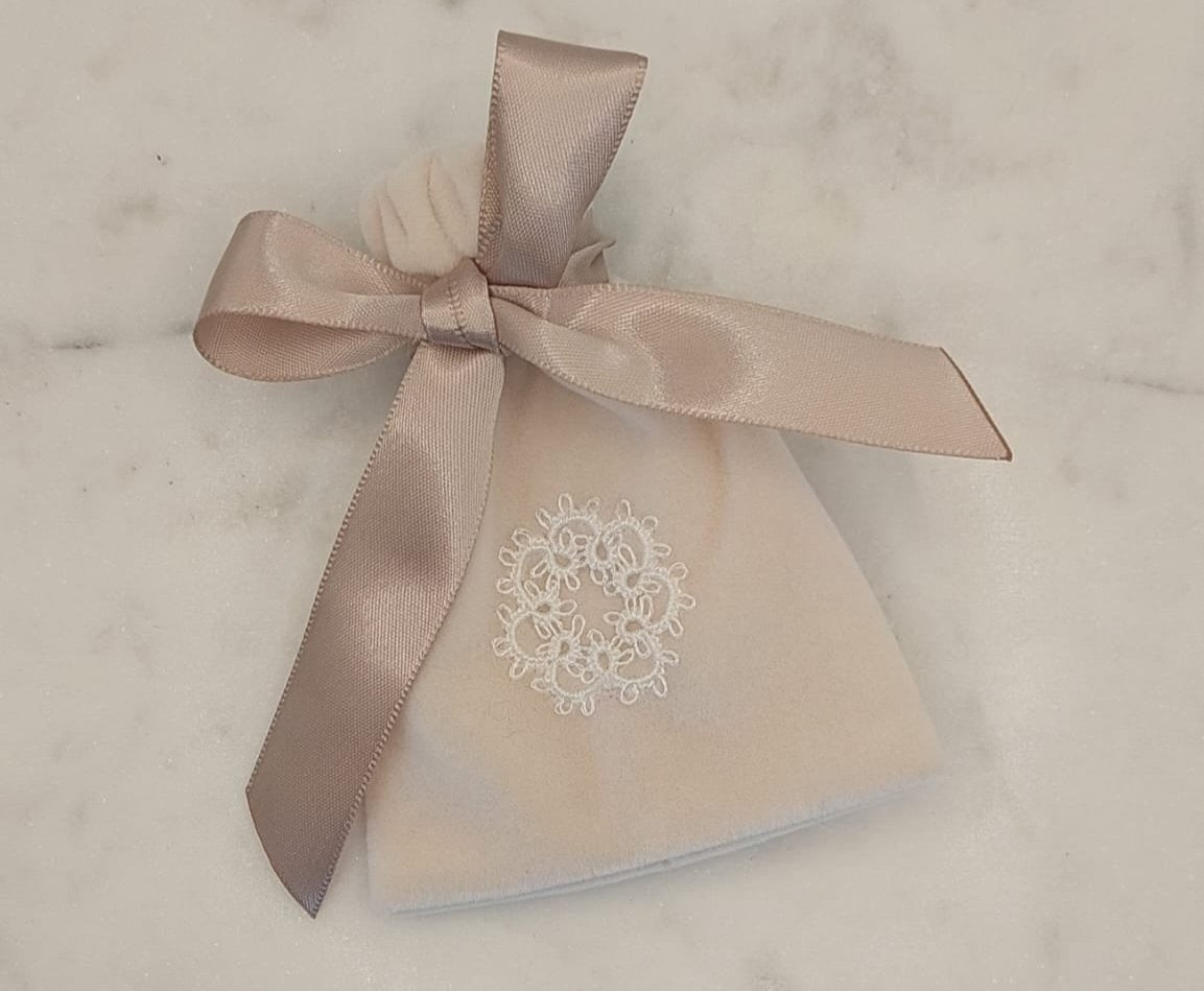 Kleines Säckchen aus Samtstoff, verziert mit einem Frivolité Deckchen / Röschen
